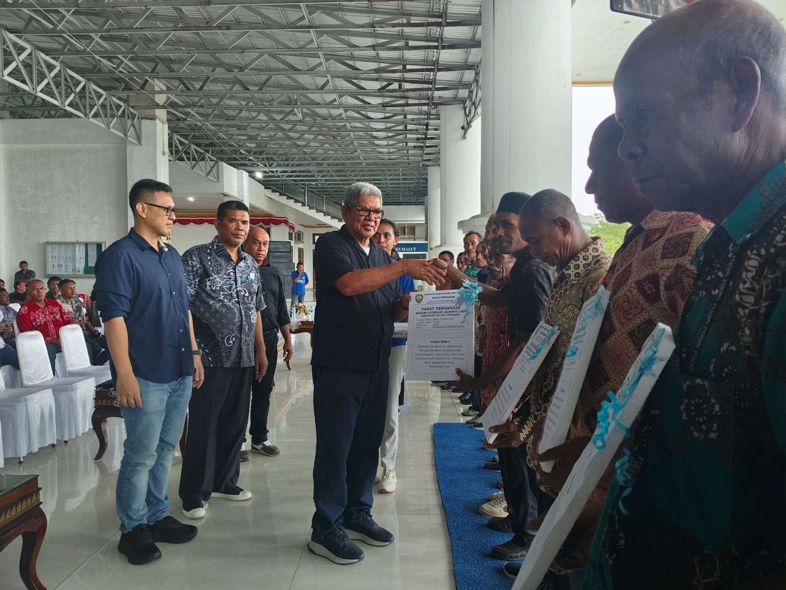 Bupati Thaher Hanubun, didamping Wakil Bupati Malra menyerahkan bantuan kepada para nelayan.