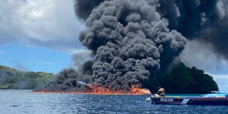Ambon, ameks.fajar.co.id.— Kapal kayu KM Sarana Perkasa dilaporkan terbakar di perairan Pulau Gunung Api Banda Naira, Kabupaten Maluku Tengah, Kamis (16/10/2025) pagi. Beruntung, seluruh awak kapal berjumlah delapan orang berhasil dievakuasi dalam keadaan selamat.