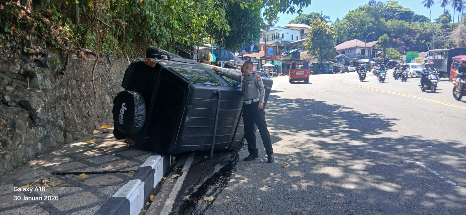 Akibat insiden tersebut, mobil Jeep kemudian terbalik. Kejadian ini langsung menarik perhatian warga sekitar yang bersama personel lalu lintas berusaha membalikkan kendaraan tersebut.