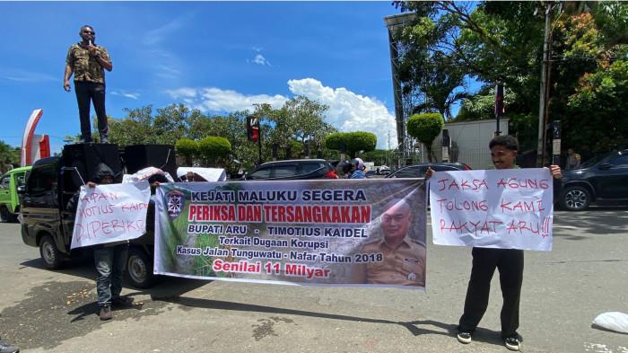Massa datang dengan spanduk bertuliskan tuntutan untuk jaksa penyidik segera memeriksa Bupati Aru, dan menetapnya sebagai tersangka. Bagi mereka, bukti-bukti sudah jelas, ada kerugian negara sebesar Rp11 miliar dari total anggaran proyek Jalan Lingkar Wokam sebesar Rp36 miliar.