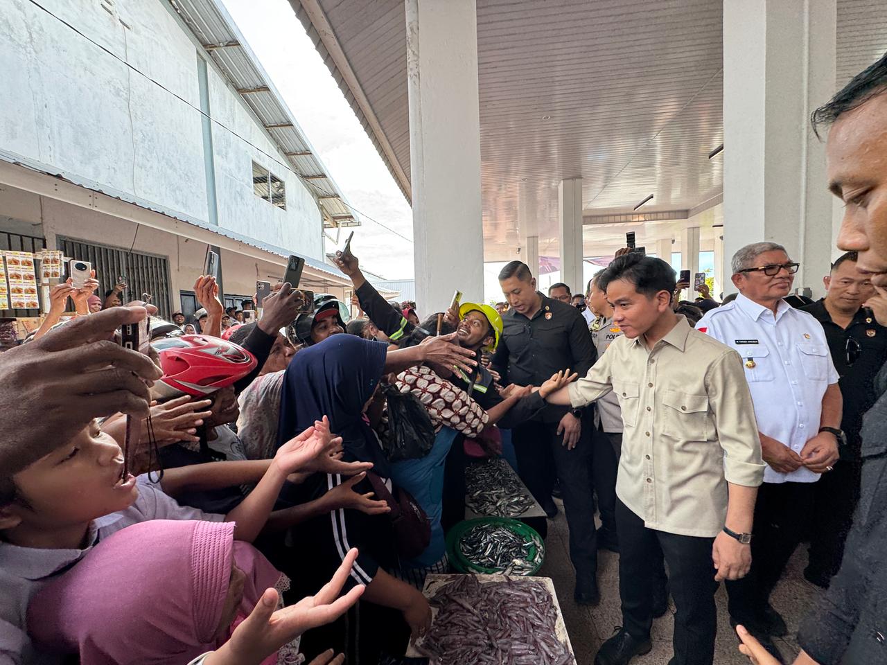 Sambil menyusuri lorong-lorong pasar, Wapres Gibran tampak berbincang akrab dengan para pedagang, menanyakan harga bahan pokok, hingga membeli sejumlah dagangan.