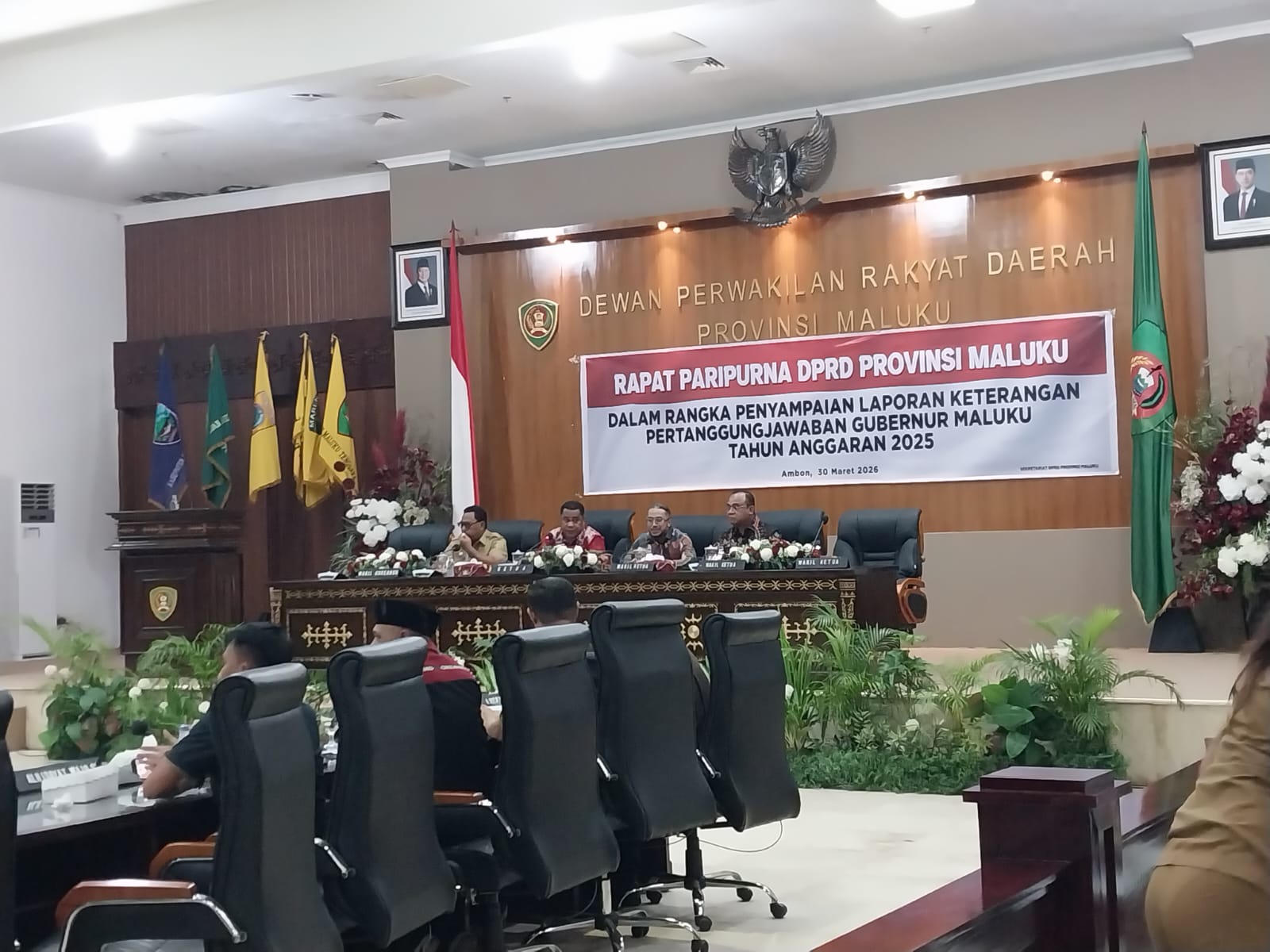 AMBON, TM — DPRD Provinsi Maluku menggelar rapat paripurna dalam rangka penyampaian Laporan Keterangan Pertanggungjawaban (LKPJ) Gubernur Maluku Tahun Anggaran 2025, Senin (30/3/2026).